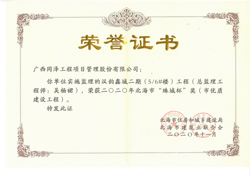 漢韻鑫城5#、6#樓榮獲2020年北海市“珠城杯獎”(市優(yōu)質建設工程)
